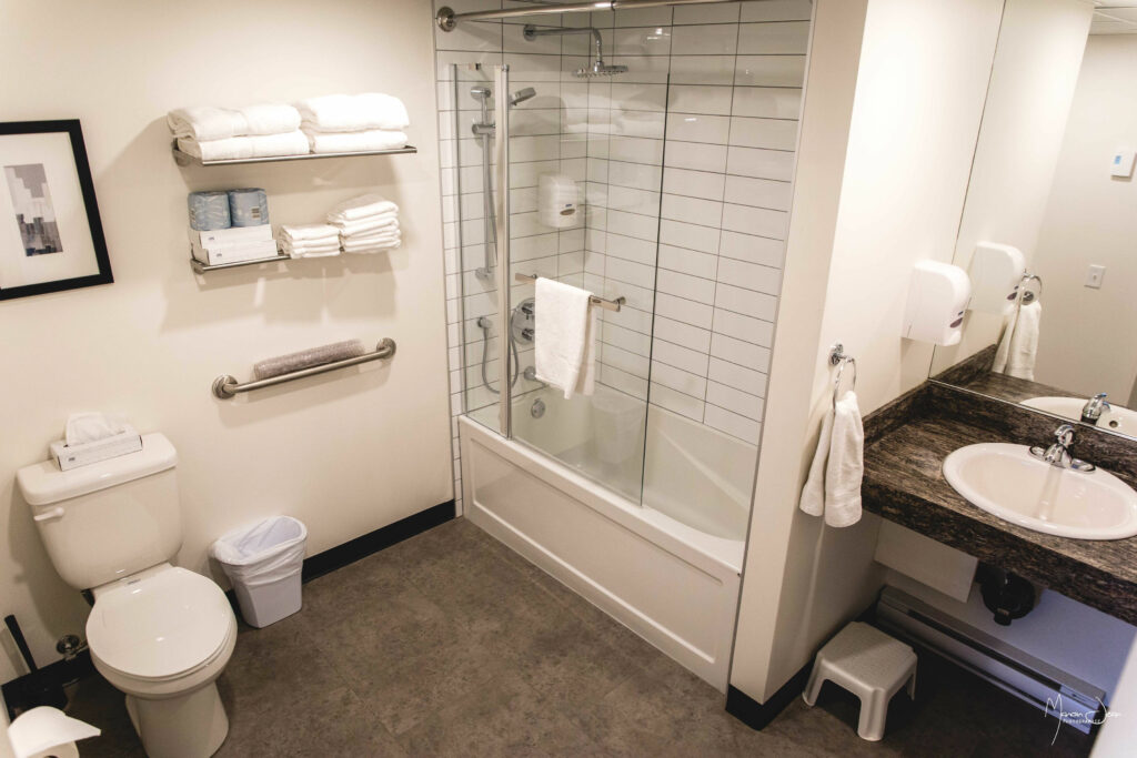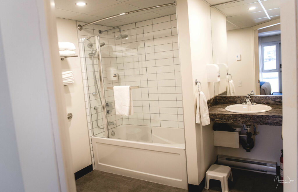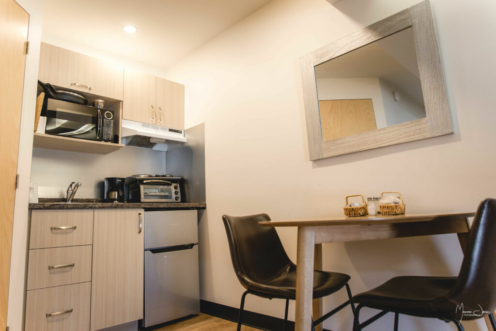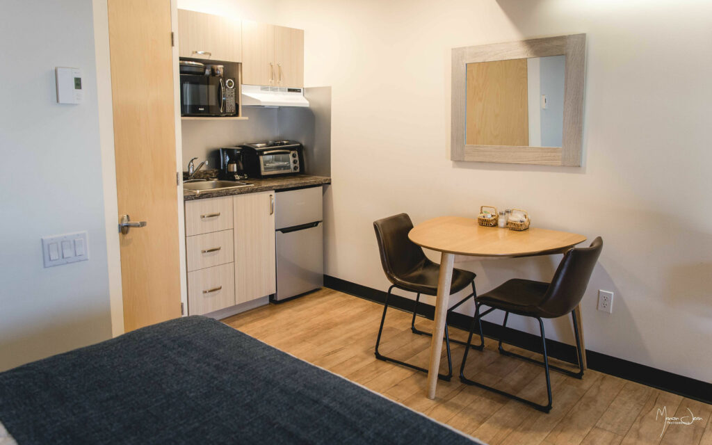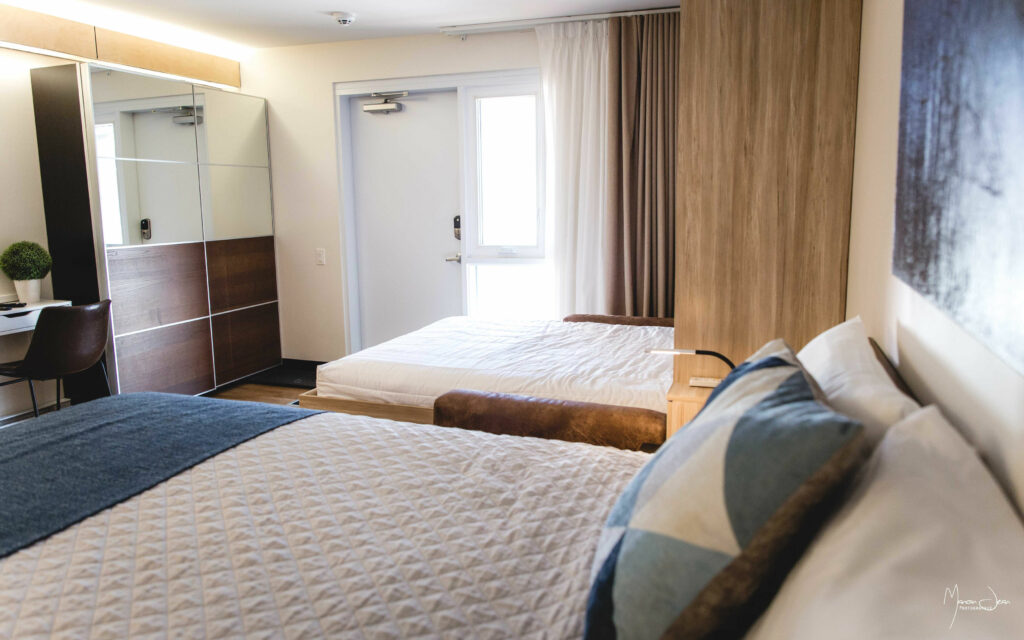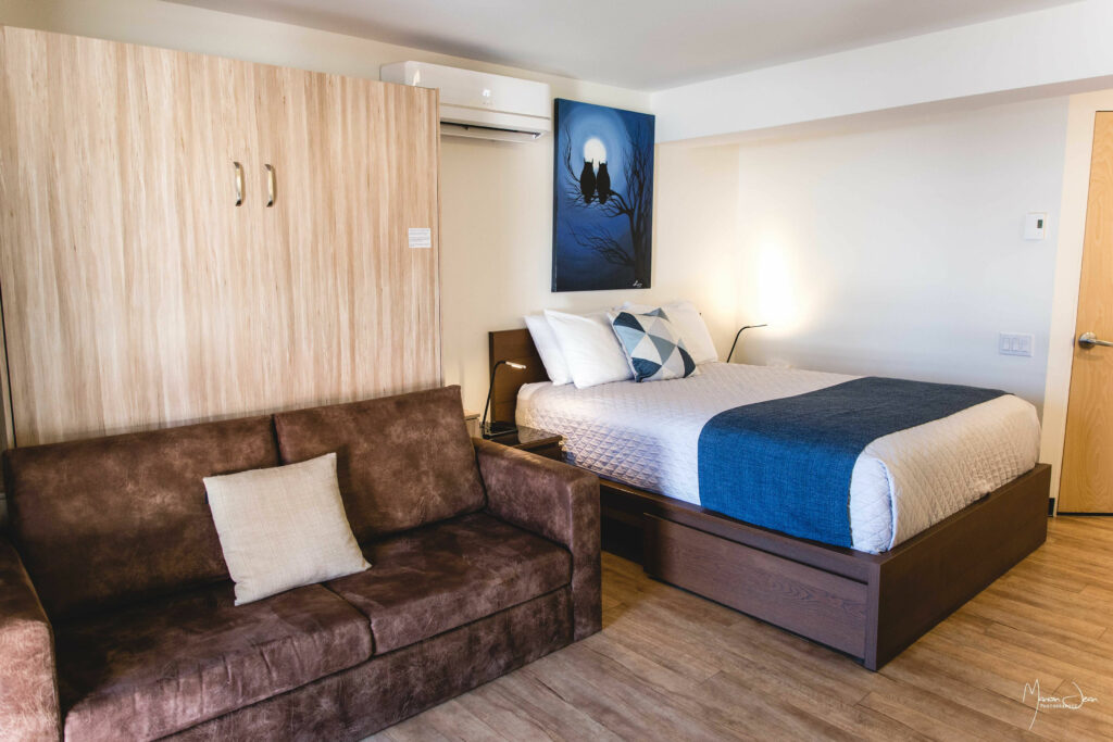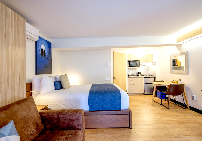 Studio avec concept ouvert. Un grand lit Queen. Beaucoup de rangement. Un coin salon avec canapé-lit mural double. Kitchenette entièrement équipée. TV 40 pouces et coin bureau. Salle de bain privée avec baignoire-douche. Idéal pour les personnes qui ont besoin de plus d'autonomie et d'espace sur un long séjour. Cette unités répondent aux normes pour les personnes à mobilité réduite. Équipement de la chambre: climatisation, sèche-cheveux, bain-douche, coin bureau, prises USB, articles de cuisine, planche et fer à repasser,