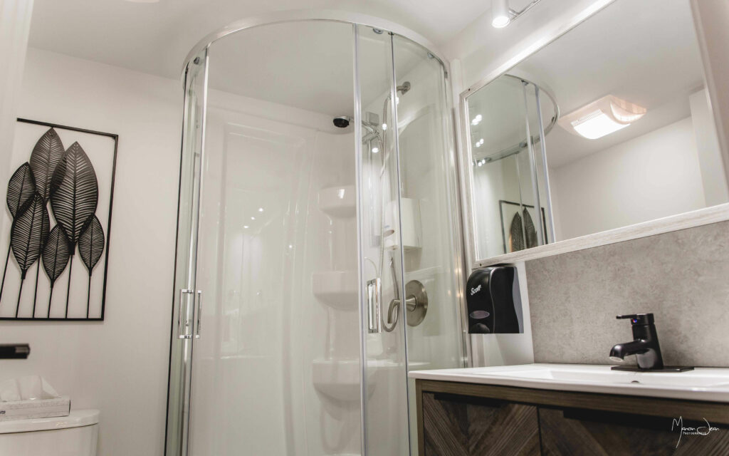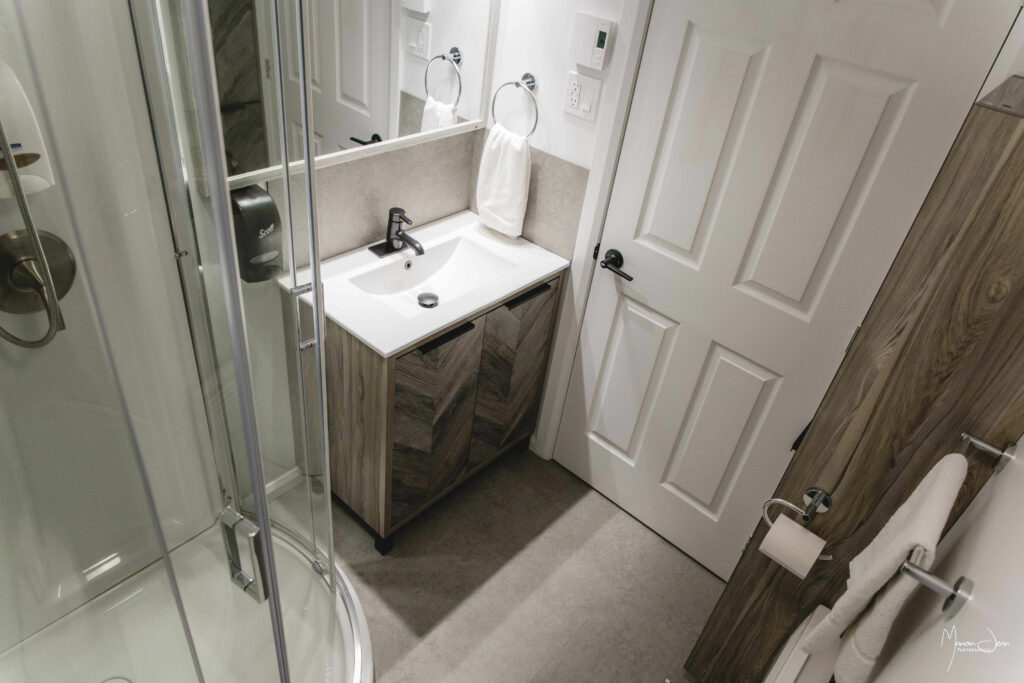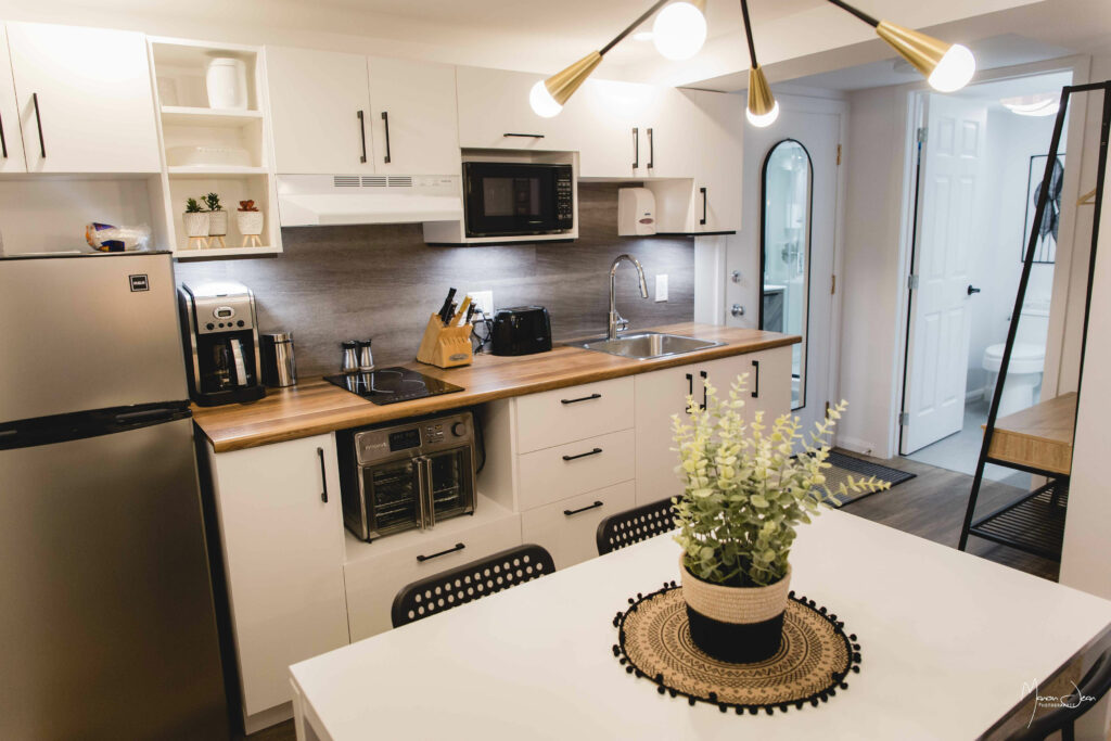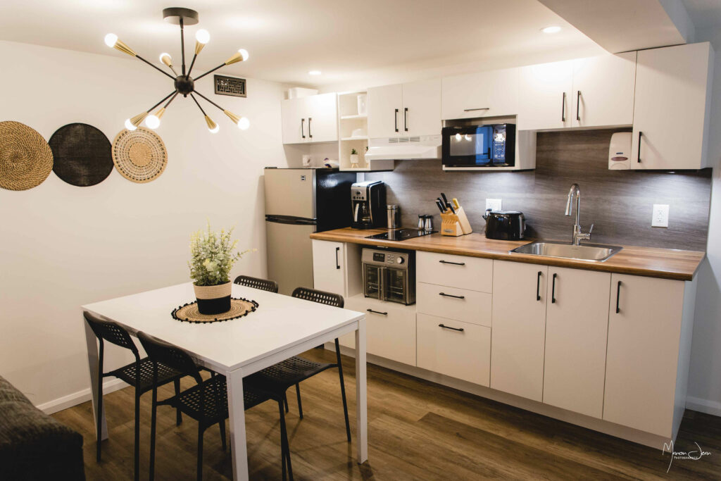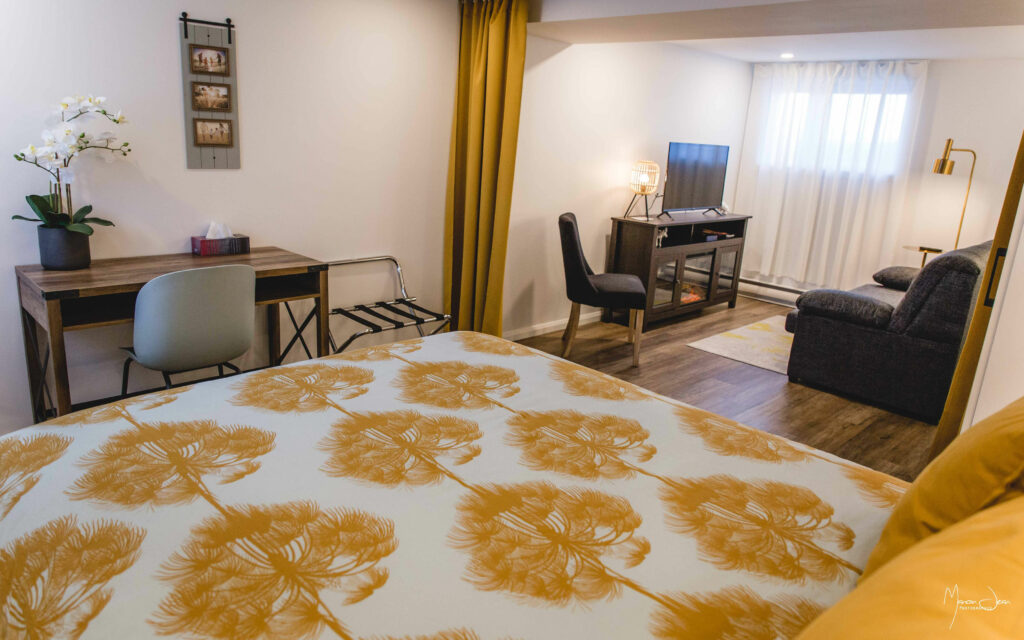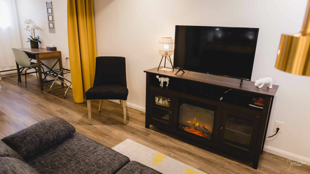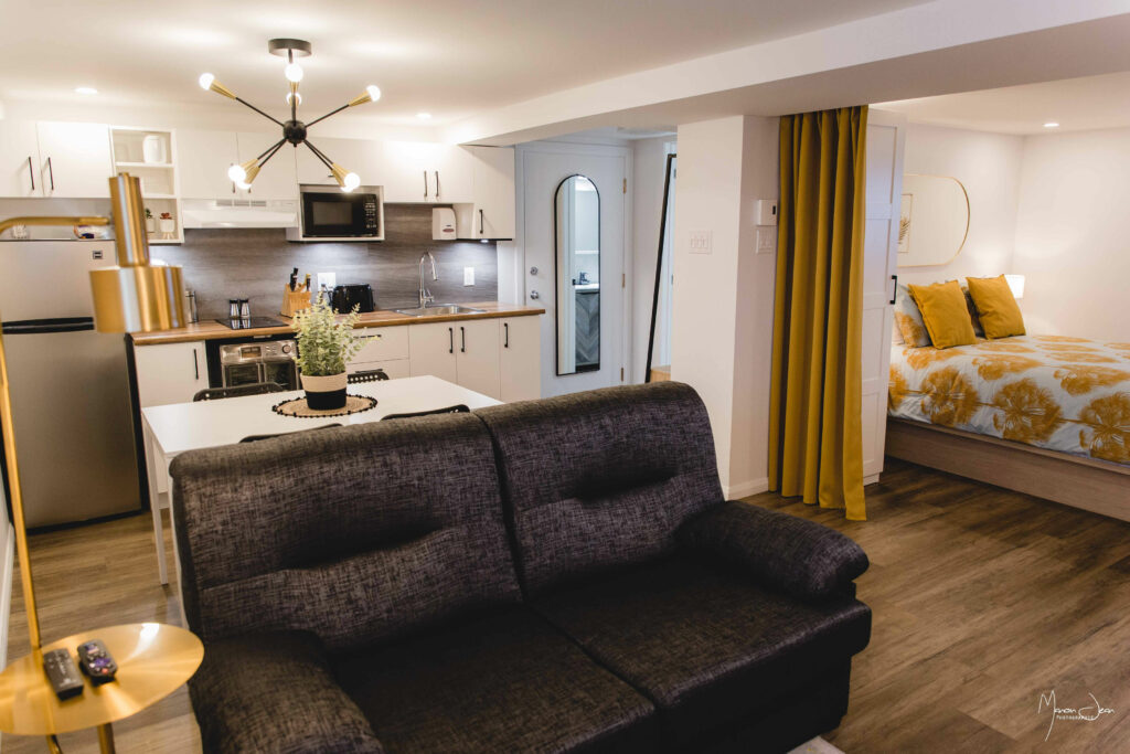 Suite au niveau de l'étage inférieur. Lit Queen, aire ouverte salon (divan lit double) et cuisine, téléviseur. Salle de bain avec douche, produits d'hygiène corporelle.