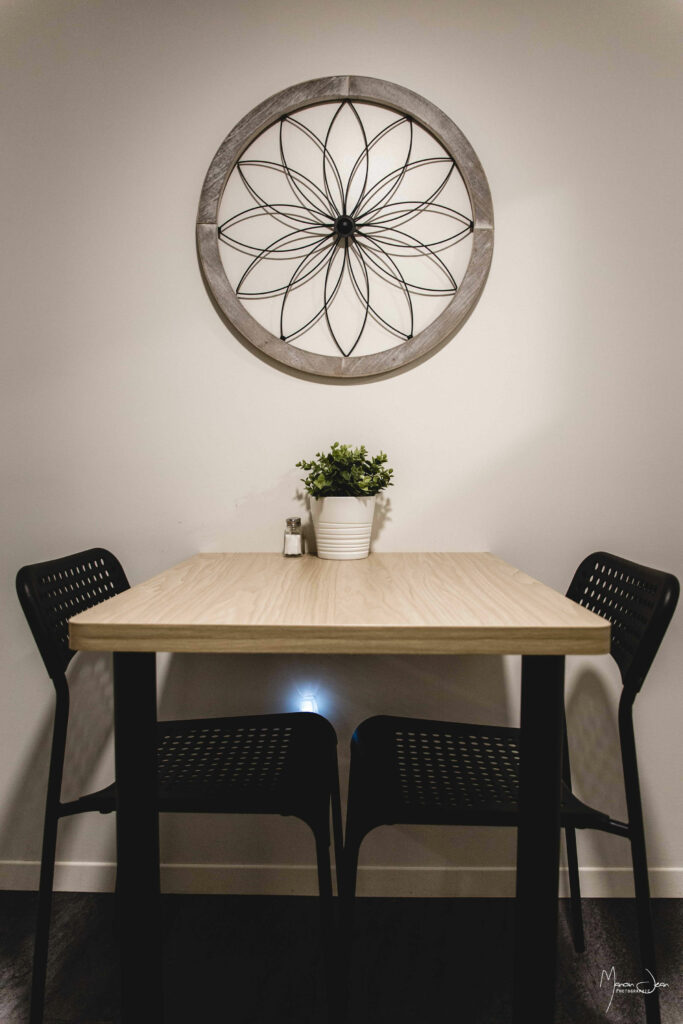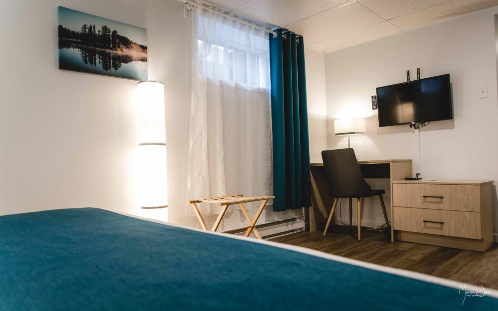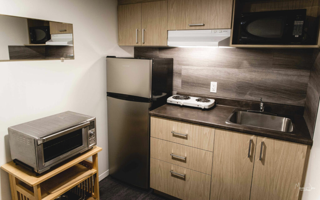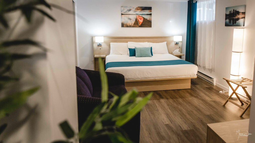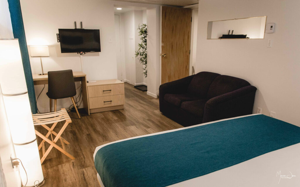 Suite à l'étage inférieur. Lit King, cuisinette complète, salle de bain avec douche et bain, produits d'hygiène corporelle, Téléviseur 40po.