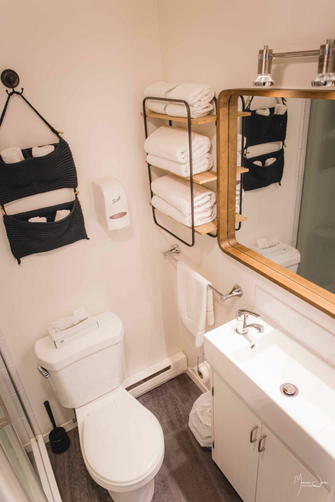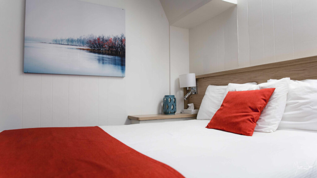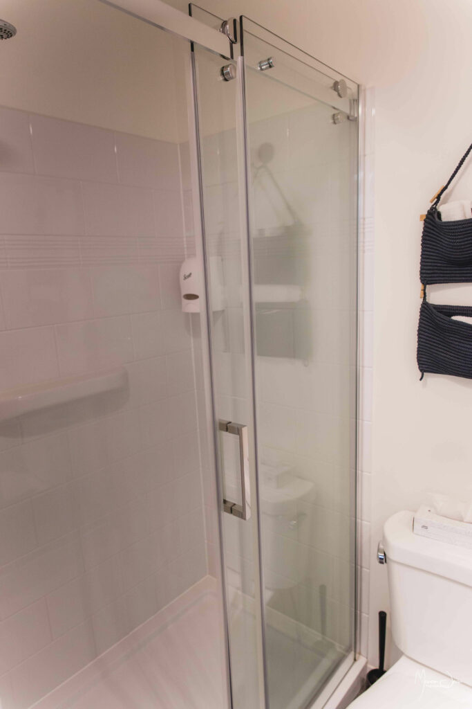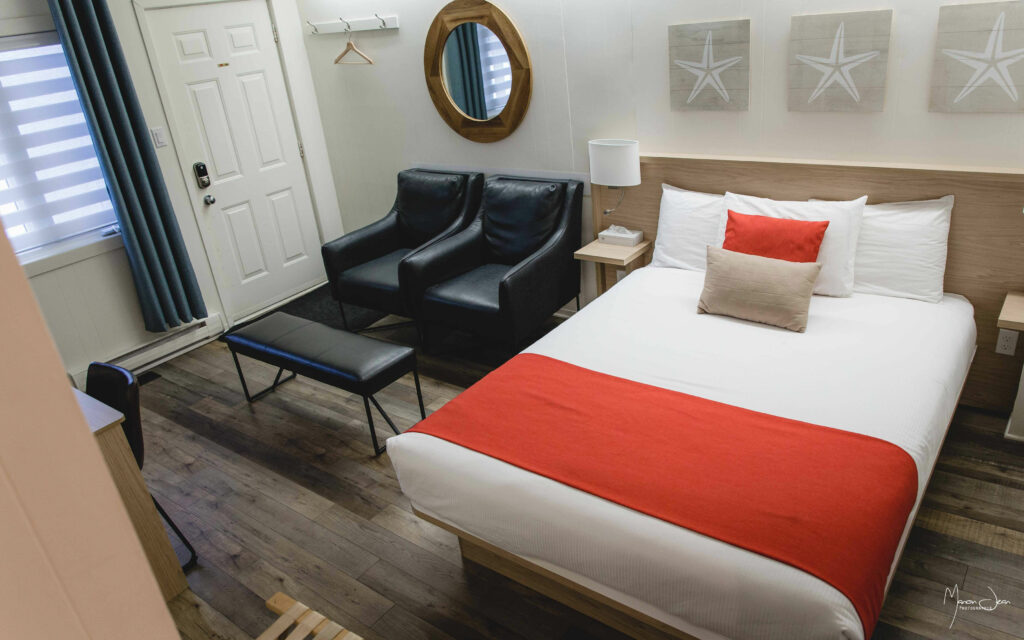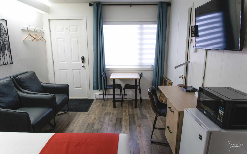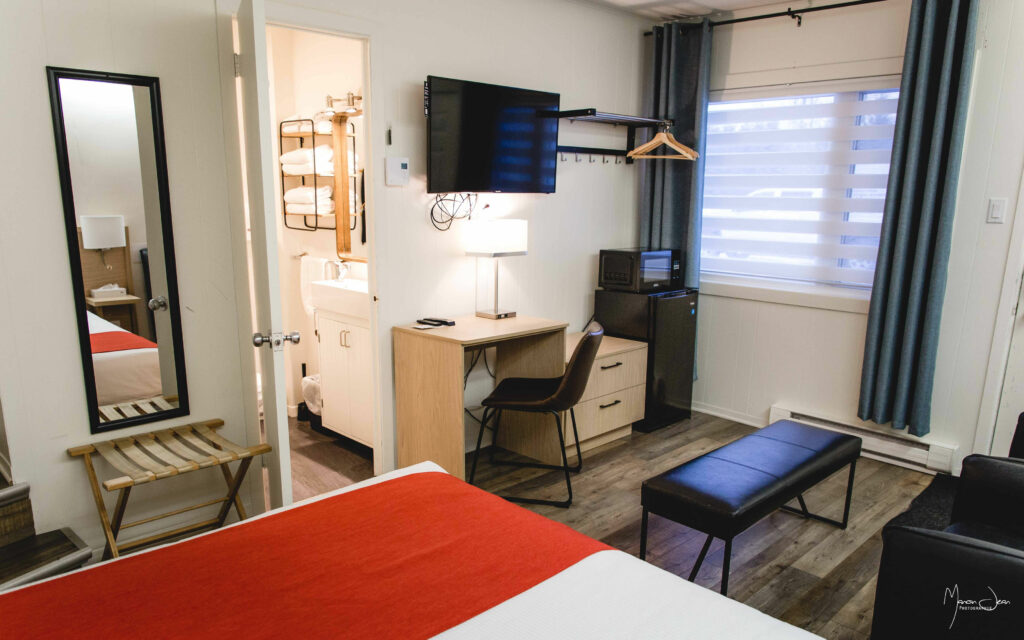 Bedroom with 1 queen bed, small sitting area, bathroom with large shower, personal hygiene products, TV, work desk.